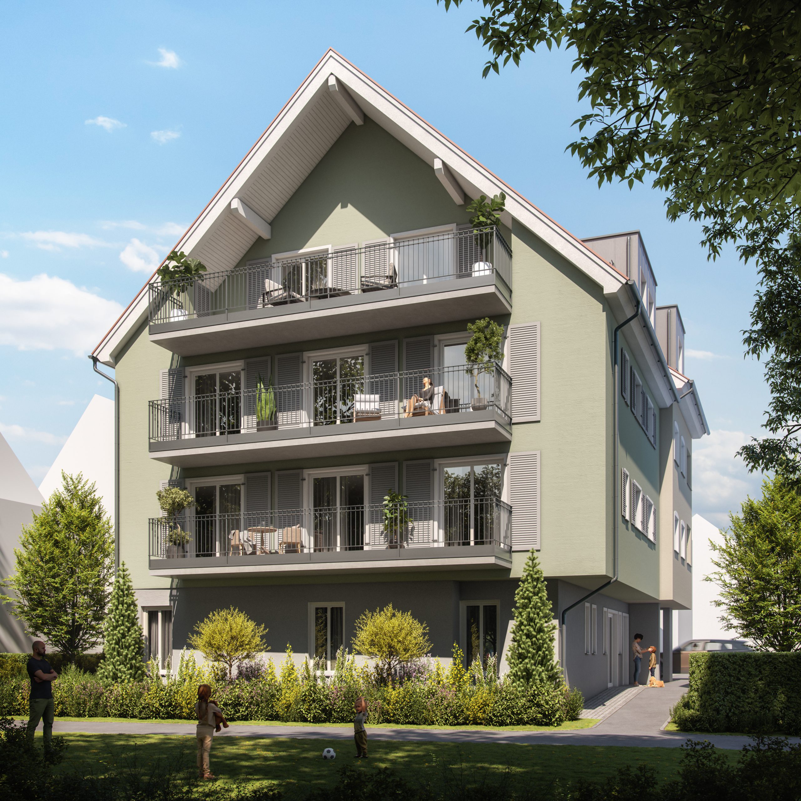 Die Erschließung der Wohnungen erfolgt durch ein großzügiges Treppenhaus und den barrierefreien Aufzug.