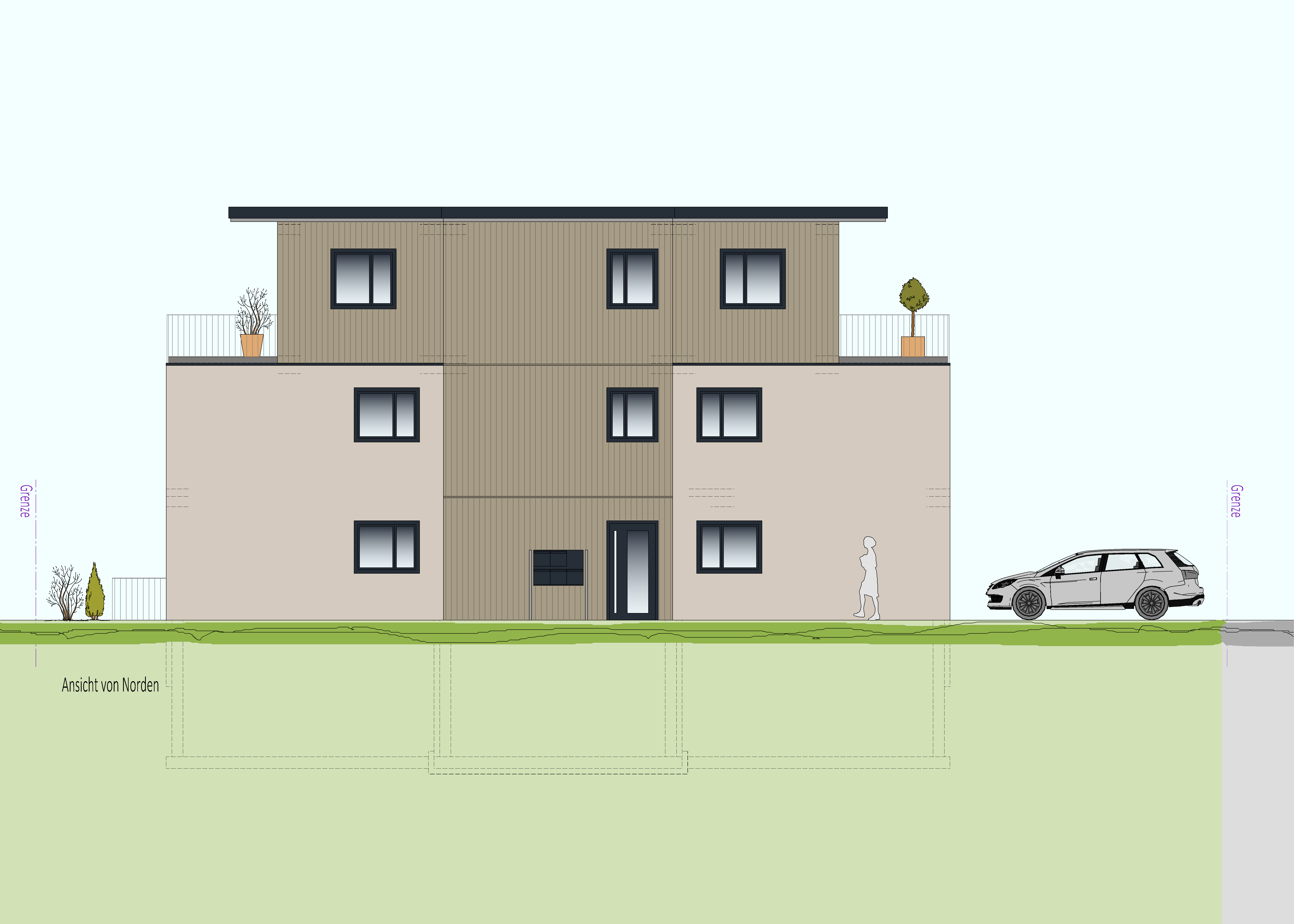 Zugehörig zu jeder Wohnung ist ein großflächiger Parkplatz geplant, darunter befinden sich 3 behinderten Parkplätze.